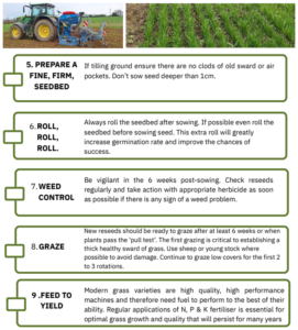 If you reseed just because you feel ‘you need to reseed’ or buy a grass mixture because that’s what the neighbours use, then you may get a poor return for your investment. Identify the field or paddock to reseed based on how much grass it typically grows or the level of weeds in the sward. Consider how you manage this piece of land and choose the appropriate grass mixture to best do the job you want it for.